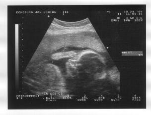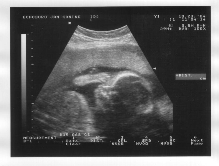 Rechts: Vooraanzicht, gezicht met duidelijk de ogen, neus en mond, en 2 vuistjes